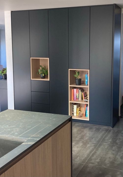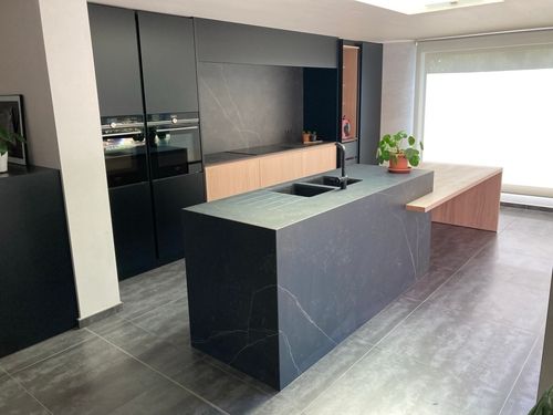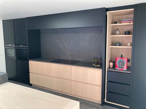 Het geheel kreeg een moderne, verfijnde uitstraling, afgewerkt met een Dekton werkblad in de kleur Kelya. De contrasten tussen warme houttinten en het diepe zwart zorgen voor een krachtig enharmonieus interieurbeeld, met scandinavische allures.