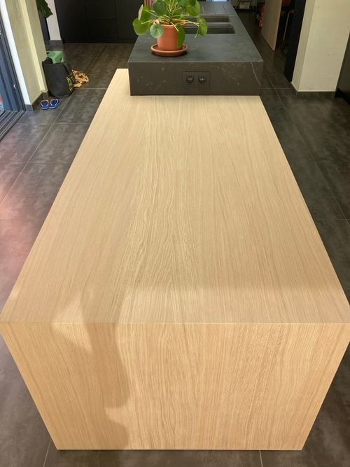 Voor dit project werd de keuken uitgewerkt in een combinatie van microstructuurlak in zwart en eikfineer, kleur 50/50 ophelmat/wit gebeitst.