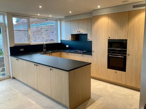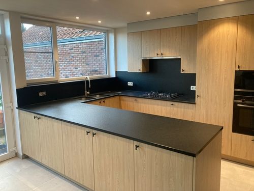 Voor deze keuken werd gekozen voor een decoratief laminaat in de kleur Dainty Oak Pure; een naturelle houtlook die warmte en rust uitstraalt.