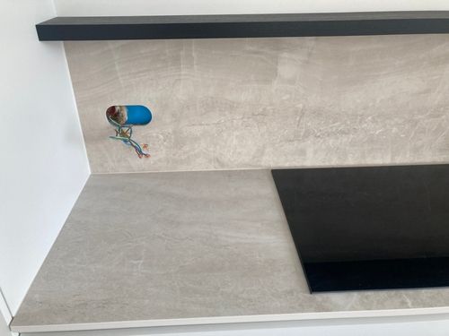 Het werkblad en de achterwand zijn uitgevoerd in keramiek, kleur Taj Mahal, een elegante en duurzame keuze die perfect aansluit bij het rustige kleurenpalet en de verfijnde materialen in dit project.