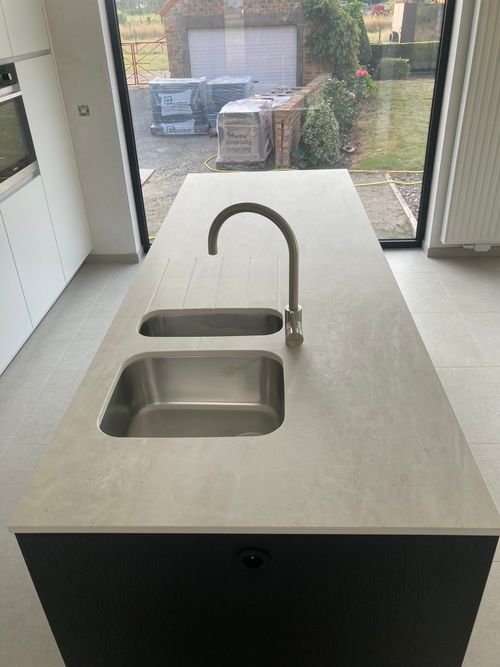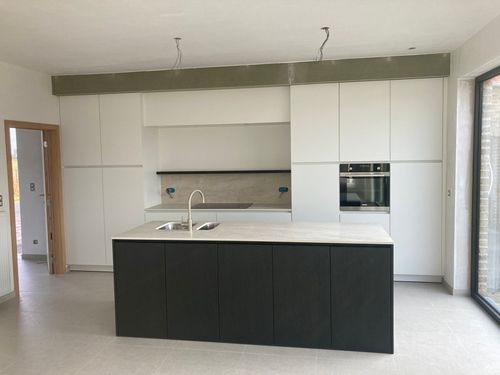 Voor deze keuken in Wingene werkten we met decoratief zwart laminaat met een subtiele houtstructuur, gecombineerd met wit laminaat voor een strak en tijdloos resultaat.