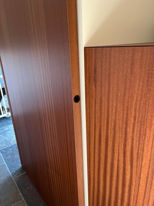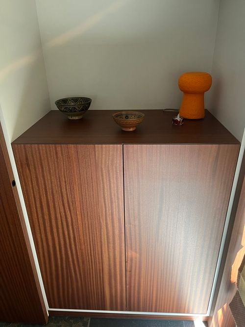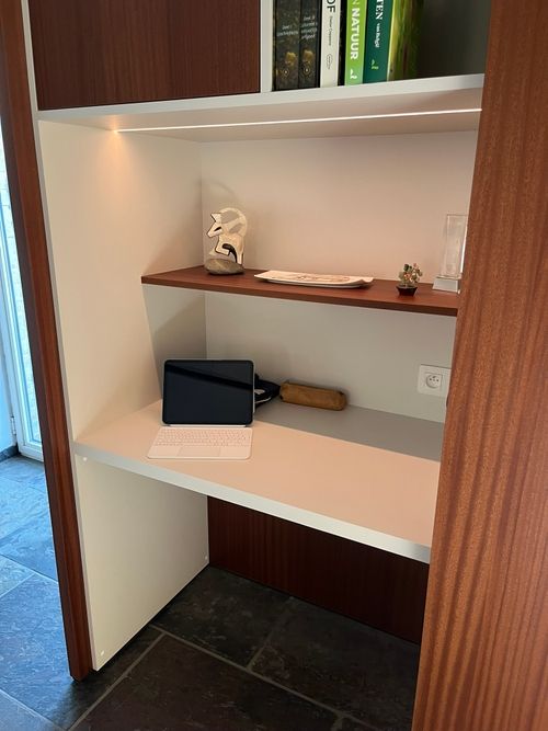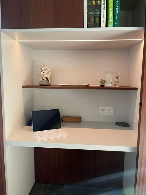 In deze woning realiseerden we een wandmeubel met geïntegreerde bureau, uitgevoerd in melamine in de zachte kleur Seashell. We combineerden dit met Shinnoki panels in de warme tint Terra Sapeli, wat zorgt voor een elegante en huiselijke uitstraling. Dankzij de schuifwand kan het bureaugedeelte discreet worden afgesloten, waardoor het meubel zich integreert in de leefruimte.