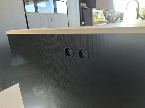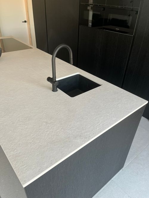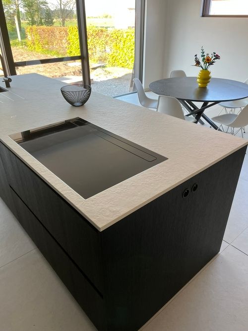 Het werkblad werd uitgevoerd in keramiek Perla Avorio Strutturato, een lichte tegenhanger die in kleur en textuur elegant contrasteert met het donkere maatwerk. De robuuste eilandopstelling biedt zowel ruimte voor koken als gezellig tafelen. Greeploze fronten en volledig geïntegreerde toestellen zorgen voor een naadloze, minimalistische beleving in deze hedendaagse moderne leefkeuken.