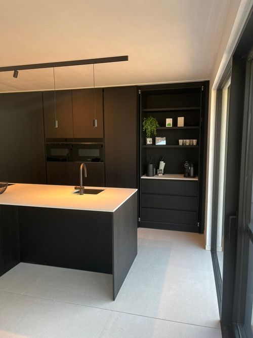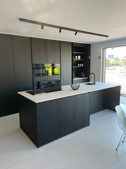 Voor project SB in Beernem werkten we een strak en tijdloos keukenconcept uit, fineer eik afgewerkt in de diepe tint wengé zwart. De verticale nerfrichting en het subtiele spel van schaduw en licht versterken de verfijnde, architecturale uitstraling van het geheel.