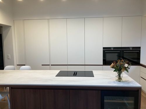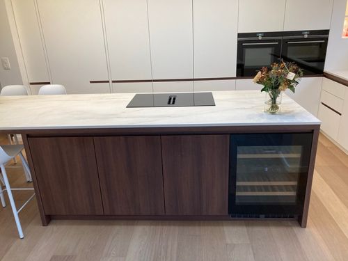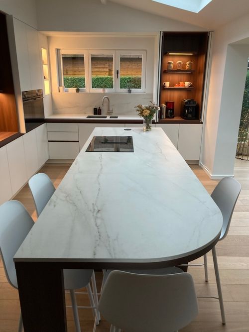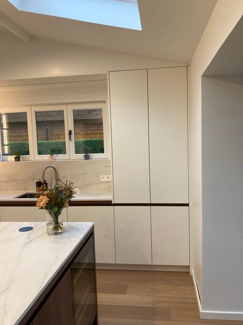 Voor deze keuken werd gekozen voor een strakke en warme combinatie van materialen. De greeploze fronten in witte microstructuurlak zijn afgewerkt met een verfijnde 45° afschuining. In contrast daarmee zorgt het laminaat in Arabic Walnut voor een warme toets die terugkomt in het eiland en de nissen.