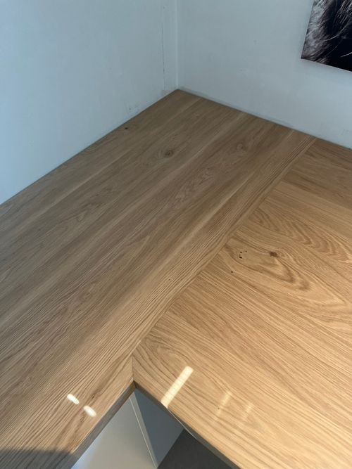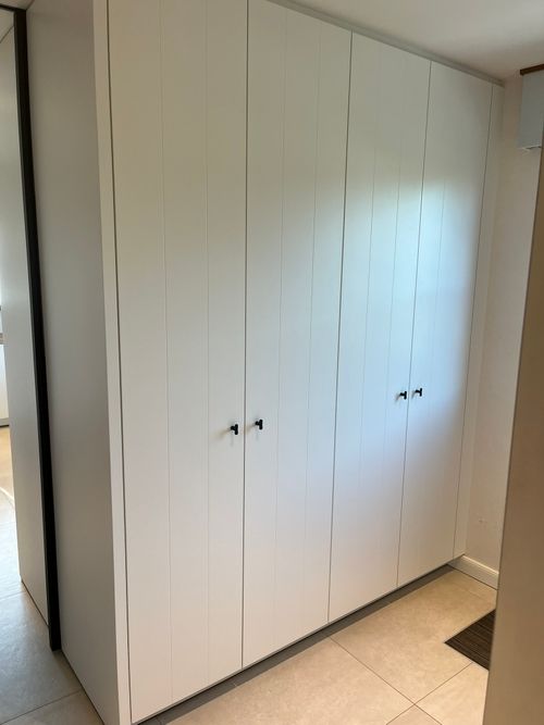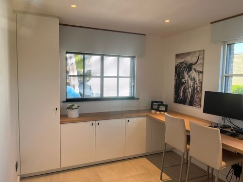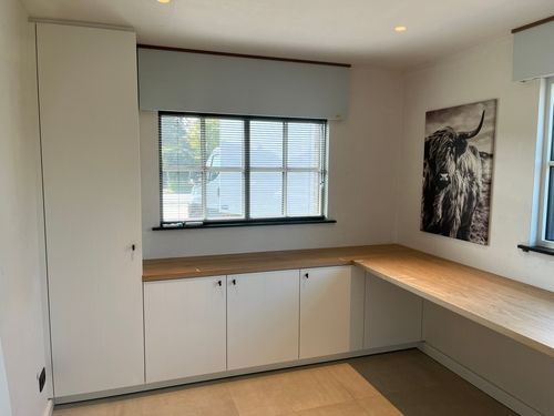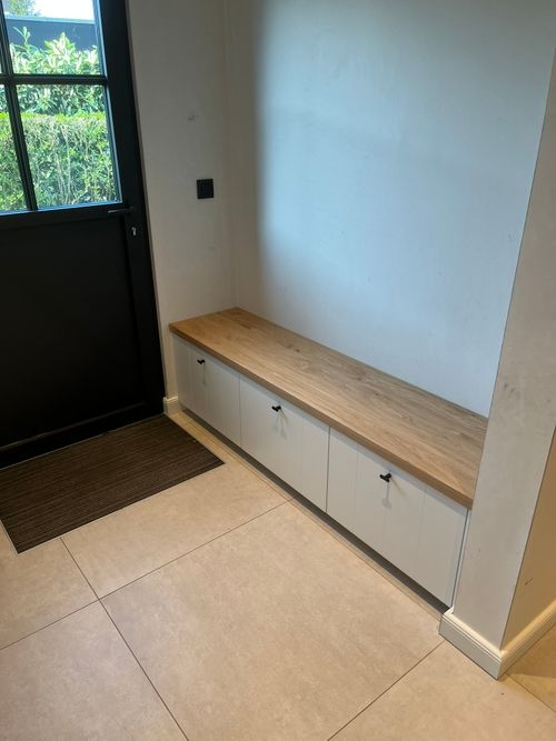 In deze woning realiseerden we een elegante en praktische thuiswerkplek en vestiaire, volledig op maat uitgewerkt. De fronten zijn afgewerkt in een witte poederlak, model Arsenal, wat zorgt voor een strakke, landelijke uitstraling. Het werkblad en de zitbank zijn vervaardigd in semio eik, zacht rustiek van karakter en uitgevoerd in de warme kleur Ophelmat.